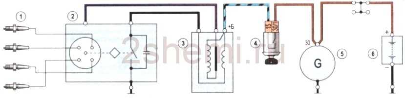 1 — звуковые устройства, использующиеся для воспроизведения импульсов; 2 — реле активации звуковых импульсов, защищает электроцепь от перенапряжения; 3 — переключатель звуковых импульсов; 4 — монтажный модуль с предохранительными элементами; 5 — генераторная установка ВАЗ 2106; 6 — АКБ.