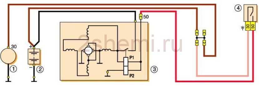 1 — стартерное устройство автомобиля; 2 — АКБ; 3 — генераторная установка; 4 — замок зажигания.