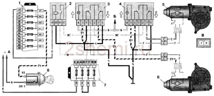 1 — главный предохранительный модуль; 2 — реле, использующееся для защиты электролинии установленных дополнительно стеклоподъемников; 3 — переключательное устройство электростеклоподъемника, установленного на левой двери; 4 — аналогичное устройство, применяющееся для регулировки положения стекла в правой двери спереди; 5 — электродвигатель левого подъемника стекла; 6 — вспомогательный модуль с предохранительными элементами; 7 — замок зажигания.