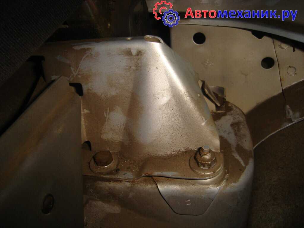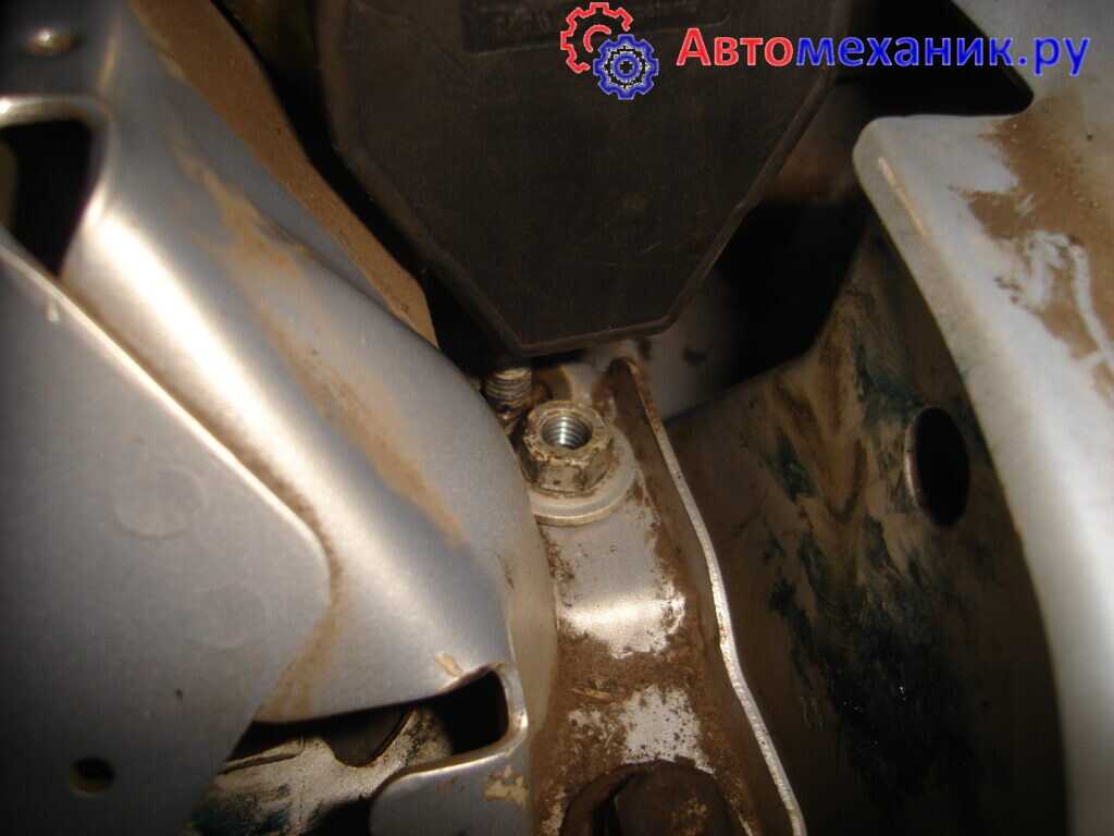 - Переходим в подкапотное пространство и откручиваем три гайки крепления опоры к кузову авто. При этом просим помощника придержать опору, чтобы она не упала на землю. После этого извлекаем узел в сборе;