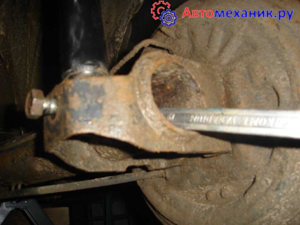 - Отделить стойку от поворотного кулака. Для этого надо отвернуть гайки ключом на 18 и вынуть болты крепления.