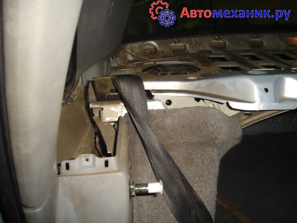 Предварительно требуется снять обшивку салона. А именно заднюю полку и щитки над кронштейном ремня безопасности. Усилий это больших не составляет. Следует отсоединить защёлки. Они просто поддеваются отверткой и освобождается.