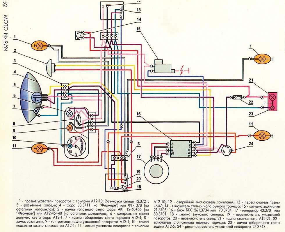 Если у вас возникли неполадки со световыми приборами мотоцикла, то следует обратить внимание на элементы под номером 1 (фара ФГ 137Б2). Также возможны неисправности с указателями поворота (на схеме это узлы 17, 29 и 34) и их прерывателем (41)