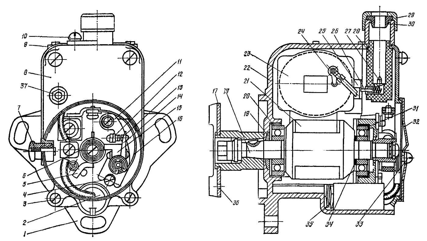 Для формирования искры, необходимой для работы пускового мотора, используется магнето с фиксированным углом опережения зажигания. В конструкции узла используется ротор, который установлен на подшипниках. При вращении в сердечнике трансформатора и магнитопроводе формируется низкое напряжение, наводящее магнитный поток. При достижении максимального тока происходит размыкание обмотки, что приводит к генерированию тока высокого напряжения в цепи зажигания.