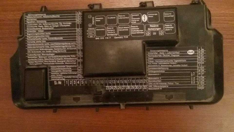 На крышке монтажного блока расположена схема элементов, также расшифровка есть в руководстве по эксплуатации автомобиля ауди 80 b3.
