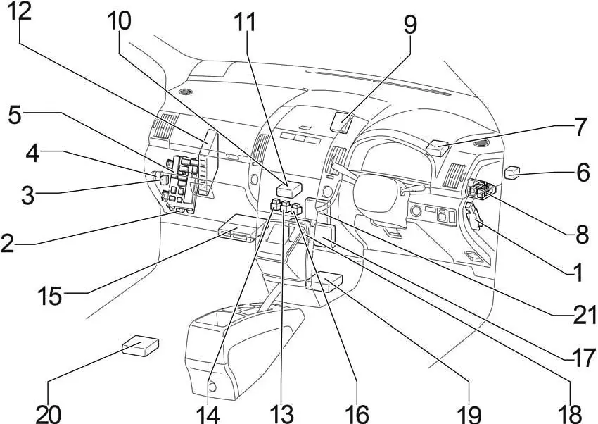 Общая схема расположения блоков в салоне Королла 150