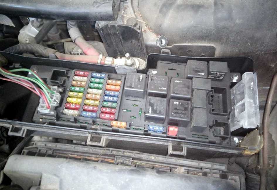 Для доступа к монтажному блоку, расположенному в моторном отсеке, извлеките пароотводящий шланг системы охлаждения из держателя на крышке монтажного блока и отведите его в сторону…. На крышку нанесена схема расположения и назначение предохранителей, плавких вставок и реле в монтажном блоке.