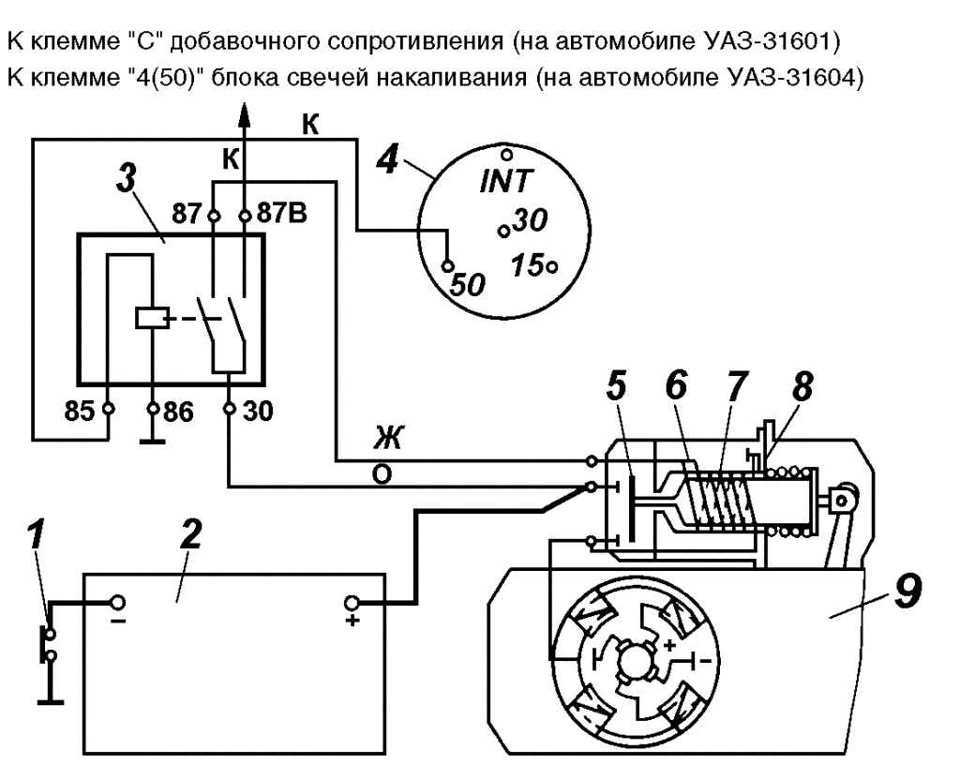 Проводка снабжает генератор, есть точки соединения для фонаря, который освещает отсек с двигателем, выходы для вентиляторного электромотора отопителя. Современная электропроводка УАЗ предусматривает свечи зажигания, питающиеся от нее. Устанавливается реле для указателей, оно используются для обеспечения работы аварийной, поворотной сигнализации.