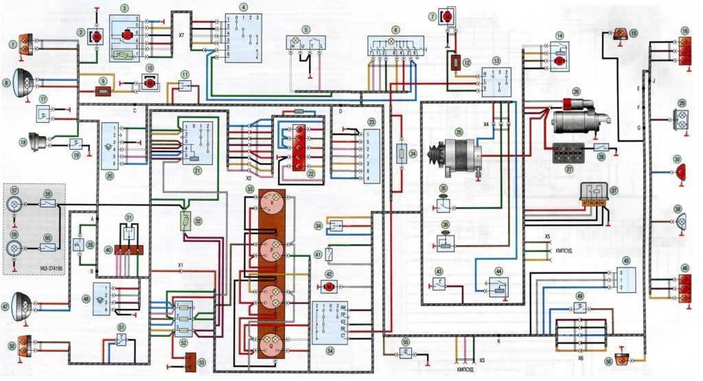 Схема электрооборудования имеет выходы на катушку, реле стартера, есть специальный датчик-распределитель, коммутатор. На одном участке имеются следующие точки: выключать массы, аварийный сигнализатор, аккумуляторная батарея, электроомыватель. Отдельно есть подключение для блока предохранителей и таких датчиков: