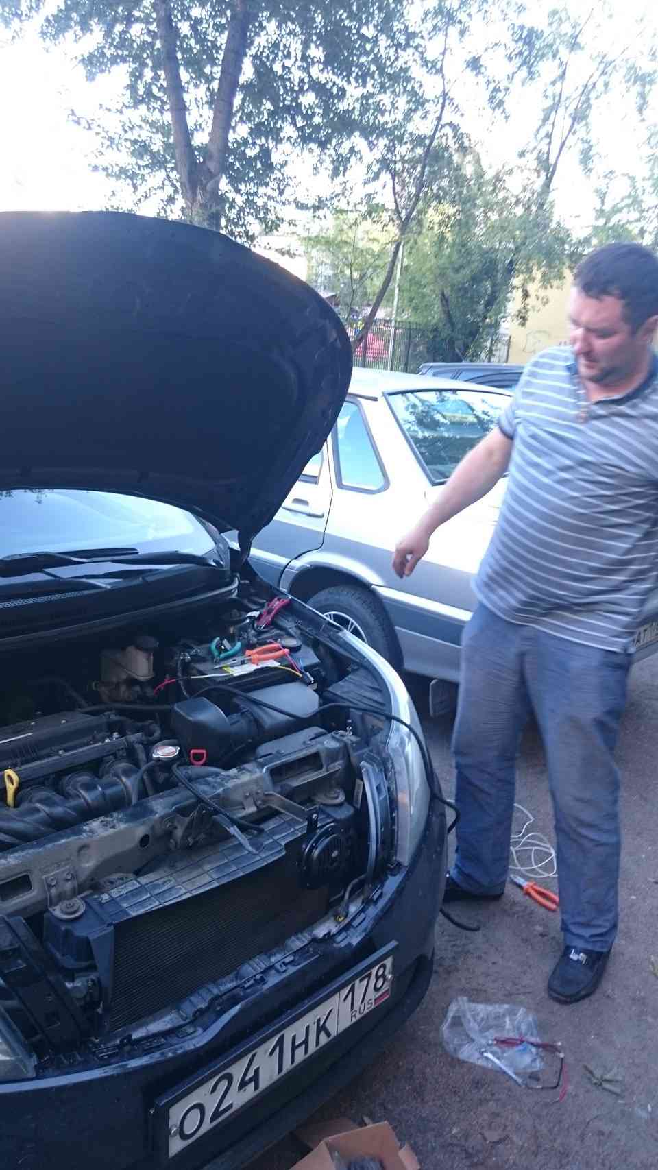 , который любезно согласился помочь с установкой сигнала безвозмездно, даже приехал в гости ради такого дела.Бампер решил я не снимать, поскольку пятой точкой чувствовал, что крепежи больше не выдержат и нужно будет менять, а в наличии нет. Открутил решетку радиатора, получили доступ к «телу». Устанавливать я попросил через реле и отдельно тянуть провода с «предом», хотя походу можно было поставить вместо штатного. Но как сказал Андрюха:- «Хозяин-барин» и начался процесс установки. Я занимался установкой самих сигналов, штатный сигнал был снят, «хеловский» с низким тоном я поставил на место штатного