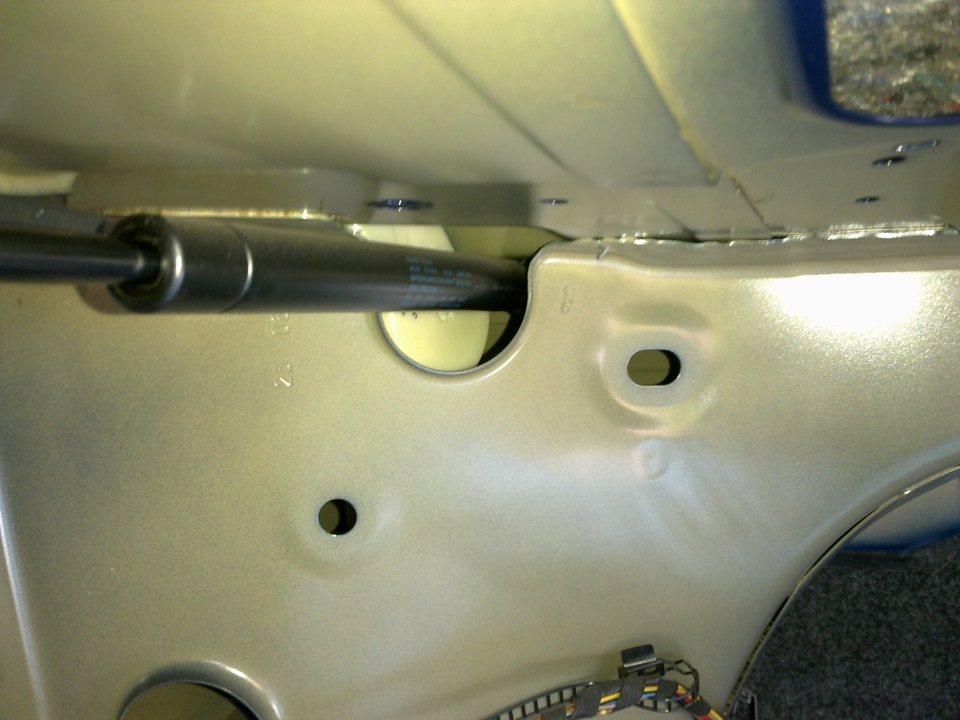 - Изнутри багажника отсоединяют амортизаторы с дальнего конца, уходящего в корпус, как показано на фото.