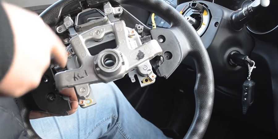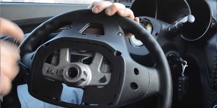 За удалением рулевого колеса – отвинчивание на нём 6 задних винтов отвёрткой с дальнейшим снятием крышки-кожуха после освобождения защёлки. В последнюю очередь – съём пластмассовых панелей-заглушек вместе с оставшимися болтами (по три на каждую).