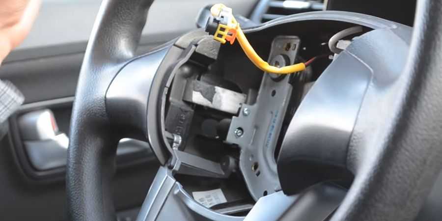 Ослабление крепежа звукового сигнала посредством Т40 в углублениях по бокам руля. Демонтаж класконного устройства. Отсоединение питания для подушки безопасности с применением ножа. Удаление лишнего, мешающего технологического разъёма.
