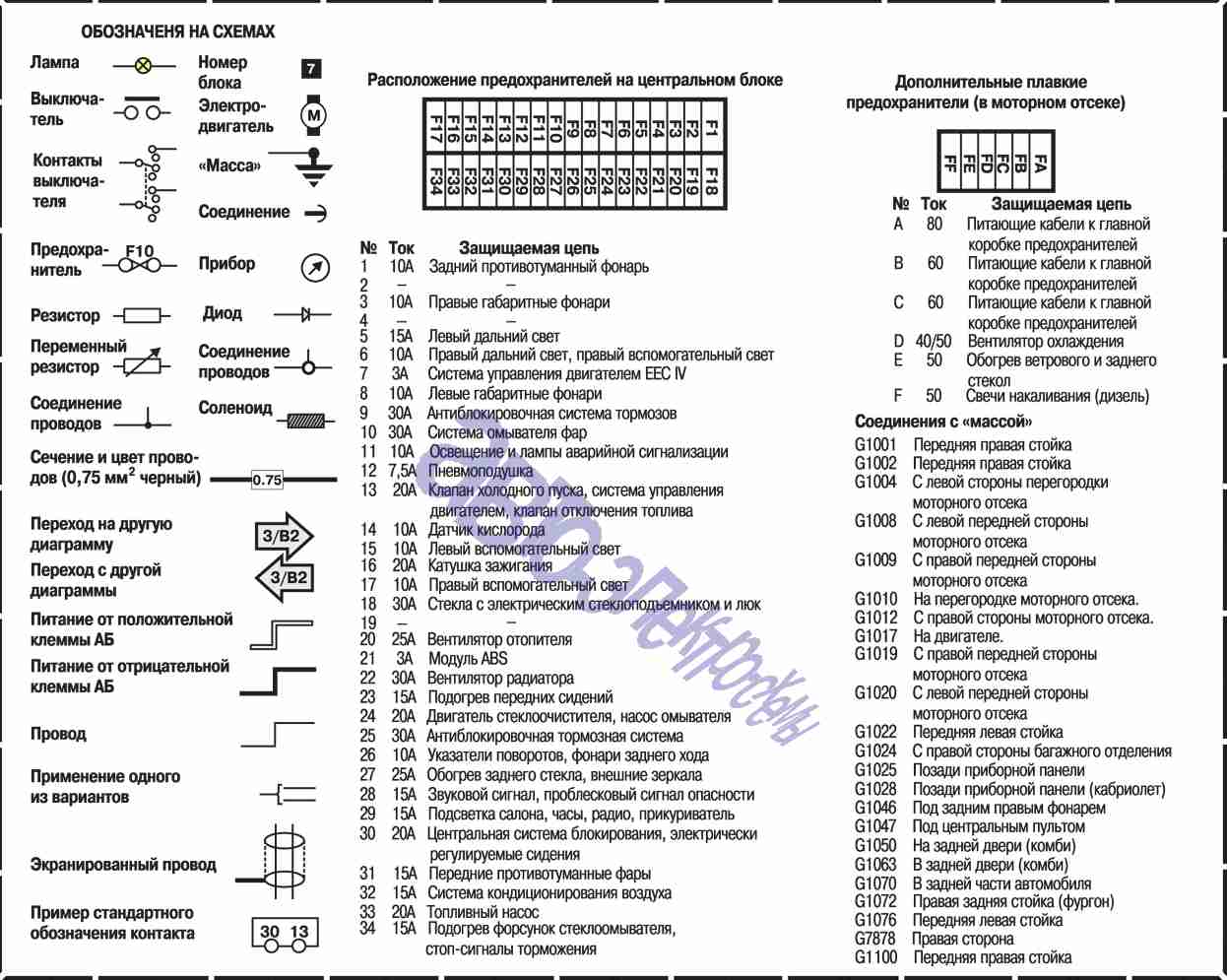 Кроме обозначения на крышке монтажного блока такими же символами, как и на панели приборов, предохранители различаются цветом: красный — 10 А, синий — 15 А, желтый — 20 А, белый — 25 А; номинальный ток указан на самом предохранителе.