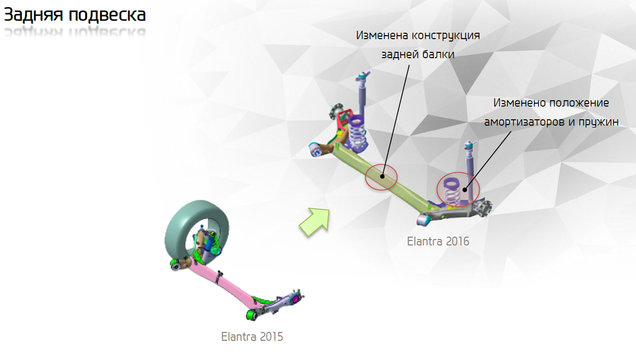 В отличие от предыдущей модели Элантра, здесь даже нет вибродемпферов, гасящих колебания, передаваемые на кузов. Но есть и свои плюсы. Помимо новой формы, подрамник оснащен утолщенным листом металла.
