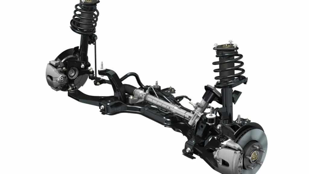 Несущий элемент подвески — подрамник закреплен к кузову через сайлетблоки. С двух сторон к подрамнику также через сайлентблоки крепятся поперечные рычаги. Рулевая тяга с наконечником является дополнительным рычагом подвески.