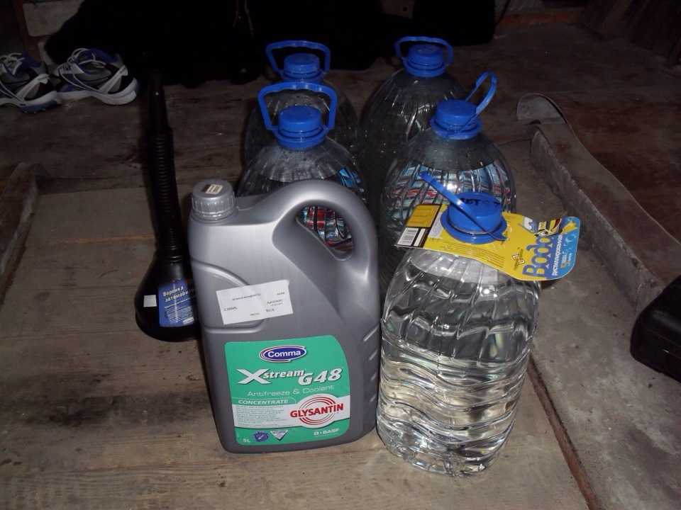 Работа не сложная. Заняла в общем где-то час. Большее время занимало прогрев авто.1. Приступаю к работе. Купил концентрат 5л и дистиллированную воду 5л и смешал для приготовления антифриза.