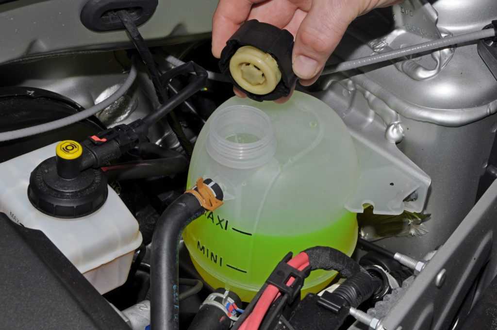 При снижении уровня до минимальной метки, надо открутить крышку расширительного бачка и долить антифриз. Потеки смеси удаляют с помощью тряпки, крышку расширительного бака закрывают.