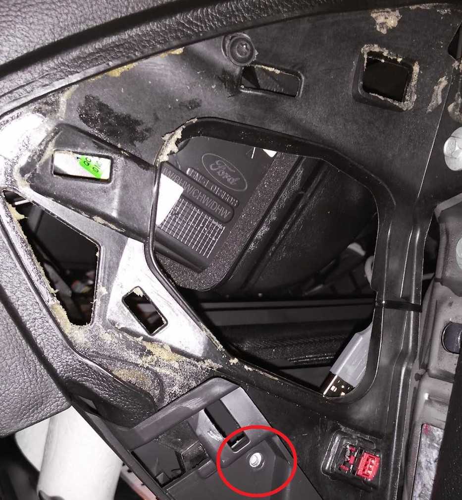 В боковой стенке центральной консоли будет установлена крышка, которую необходимо снять; В моделях Фокус 3 разных годов выпуска эта крышка закреплена по-своему. В одних она прикручена болтом с головкой под крестовую отвертку, у других – с головкой торкс Т15, а у третьих этого болта вообще может не быть. Если болт все-таки имеется, выкручиваем его; Крышка также держится при помощи двух фиксаторов, расположенных по ее бокам. Нажимаем на эти фиксаторы, немного оттягиваем крышку на себя, а затем тянем вниз и снимаем ее;