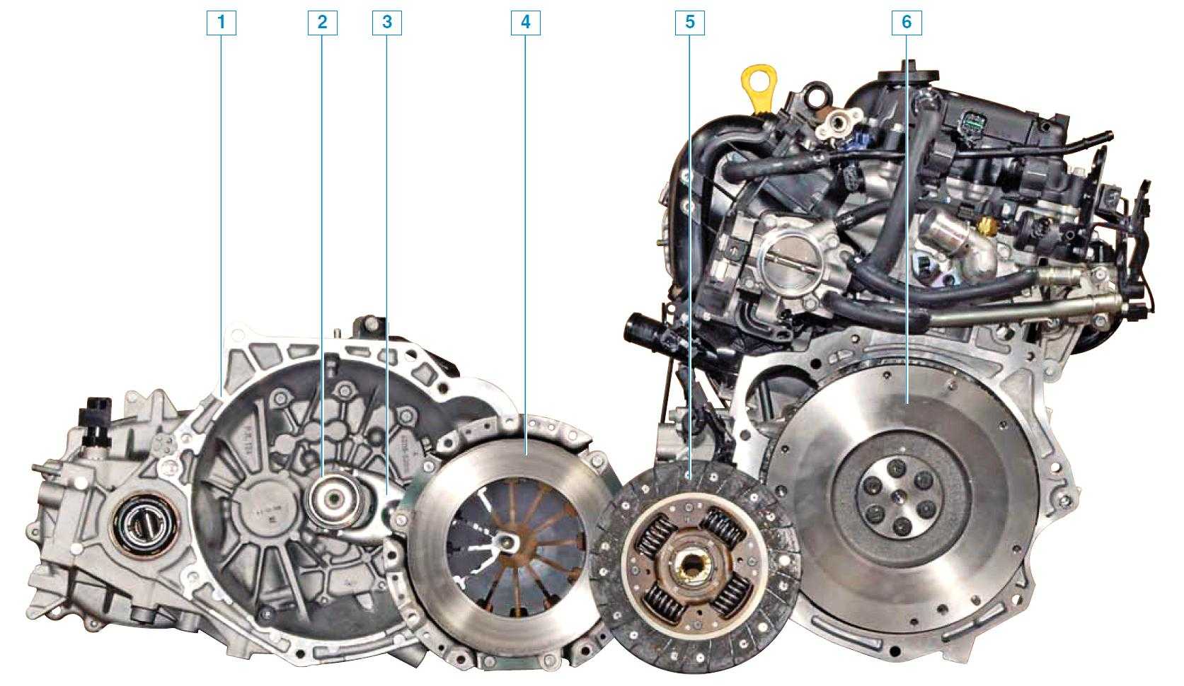 Элементы сцепления: 1 – картер сцепления; 2 – подшипник выключения сцепления; 3 – вилка выключения сцепления; 4 – нажимной диск с кожухом сцепления в сборе («корзина» сцепления); 5 – ведомый диск; 6 – маховик.