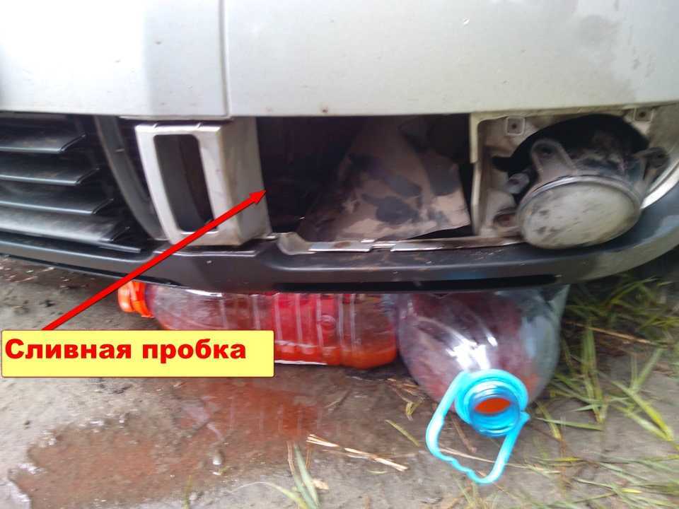 Для удобства переднюю часть автомобиля лучше приподнять. Ёмкость для слива отработанного антифриза размещается под левой стороной радиатора. Перед тем как открутить сливной кран, нужно снять крышку бачка, иначе вакуум не позволит вытечь жидкости. Сам сток находится в нижней части.