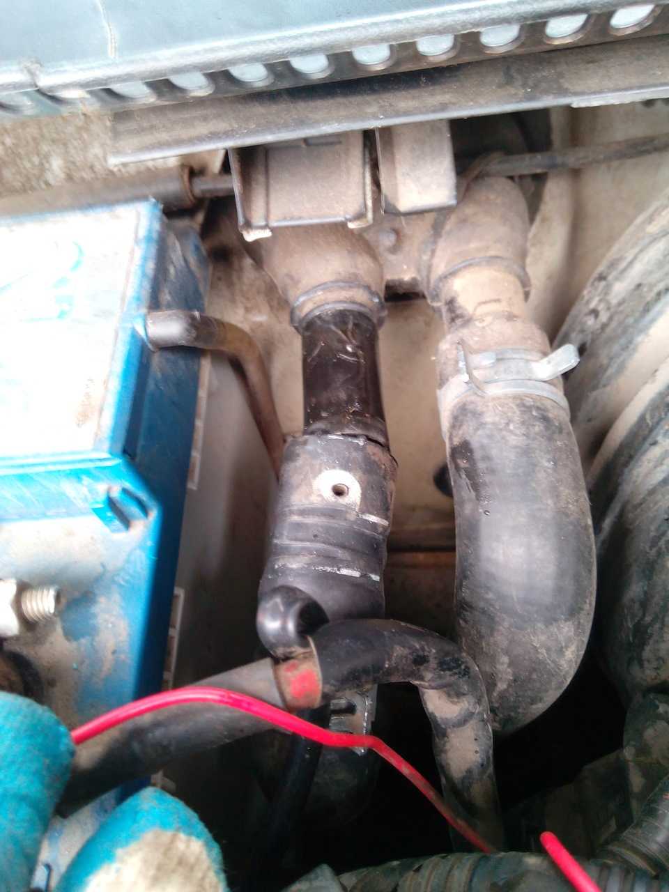 Затем стянул шланг у печки левый (с белым кругляшком), вылилось ещё немного антифриза