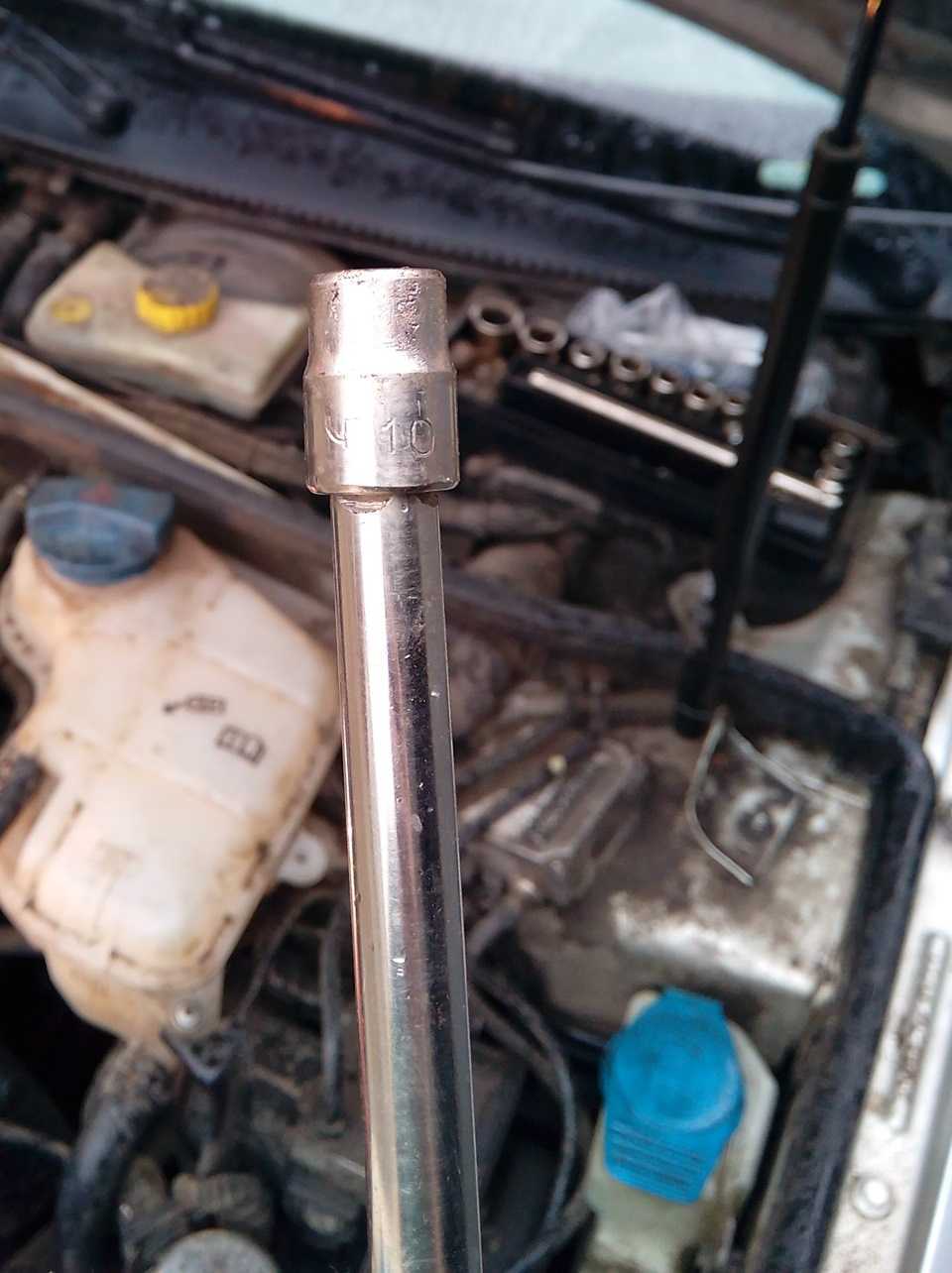 Затем немного WD-40 на крепление термостата и начал его снимать. Шестигранником подлезть не смог, но открутилось хорошо головкой на 10, но с длинным воротком.