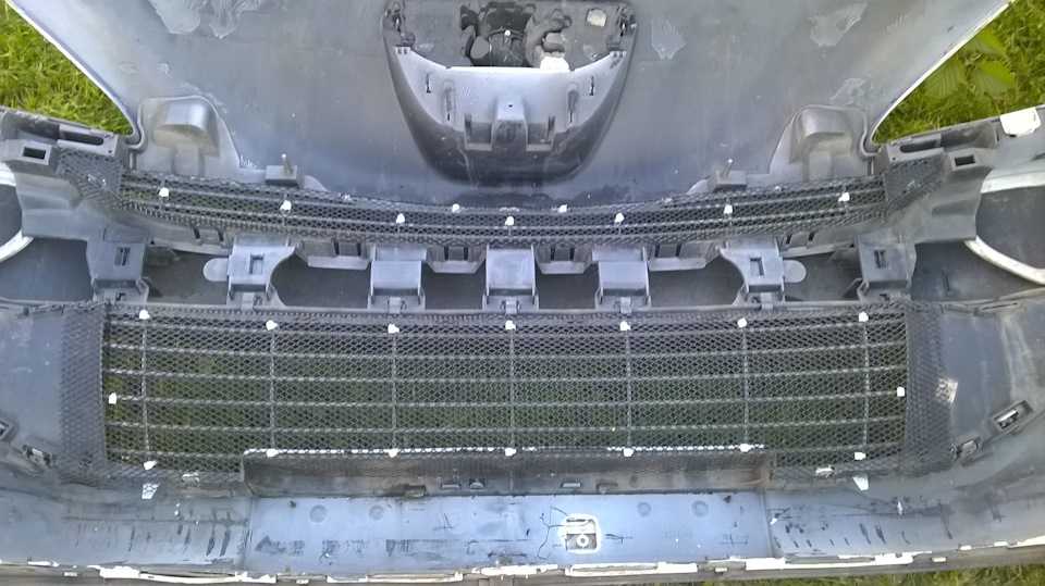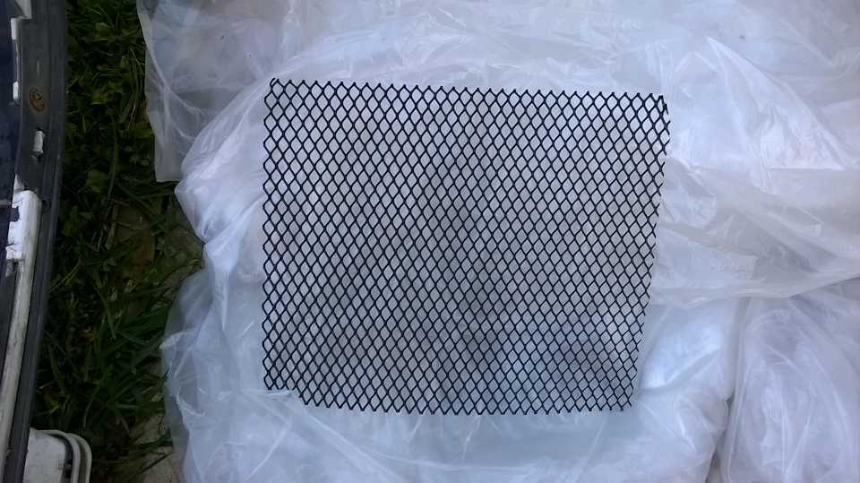 Кладем бампер на что-нибудь мягкое, я положил на газон, чтобы не царапать мордашку, хотя она и так изрядно побита камушками. Имеющейся сетки как раз хватает на узкий верх и широкий низ, отмеряем и ножницами по металлу отрезаем нужный кусок сетки. Загибаем сетку и крепим ее нейлоновыми хомутами.