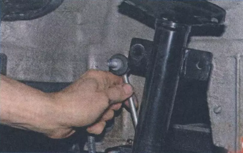 …высокой головкой «на 21» с наружным шестигранником (или захватив наружную поверхность головки трубным ключом) ослабляем затяжку гайки верхнего крепления амортизаторной стойки, удерживая шток амортизатора от проворачивания шестигранником «на 6». Снимаем колесо и надежно фиксируем автомобиль на подставке заводского изготовления.