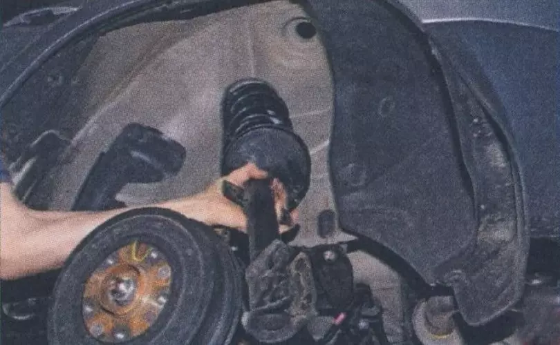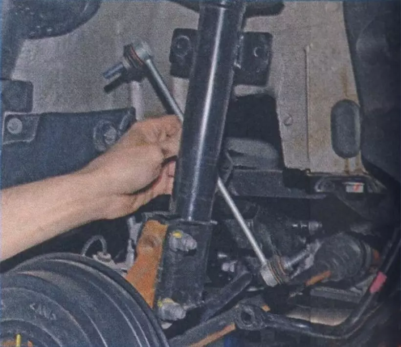 Отводим стойку от поворотного кулака. Удерживая стойку от падения, окончательно отворачиваем гайку ее верхнего крепления.