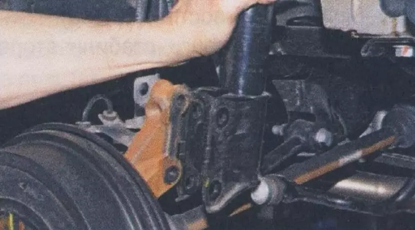 Ключом или головкой на 18 дюймов открутите гайки, которые крепят рейку к манжете. Затем снимите нижний кронштейн. Если болты застряли, их можно вытащить с помощью специального металлического выколотки.