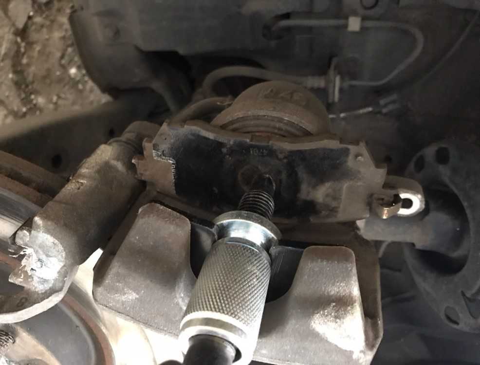 24. Если часть поршня, которая выступает с тормозного цилиндра, мешает установке колодки, нужно утопить поршень обратно в цилиндр. Для этого, возьмите специальное приспособление и уприте его на выступы суппорта.