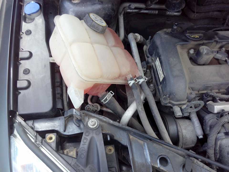 - Демонтируем расширительный бачок, сделать это несложно, просто вынимаем его из двух кронштейнов, потянув вверх.