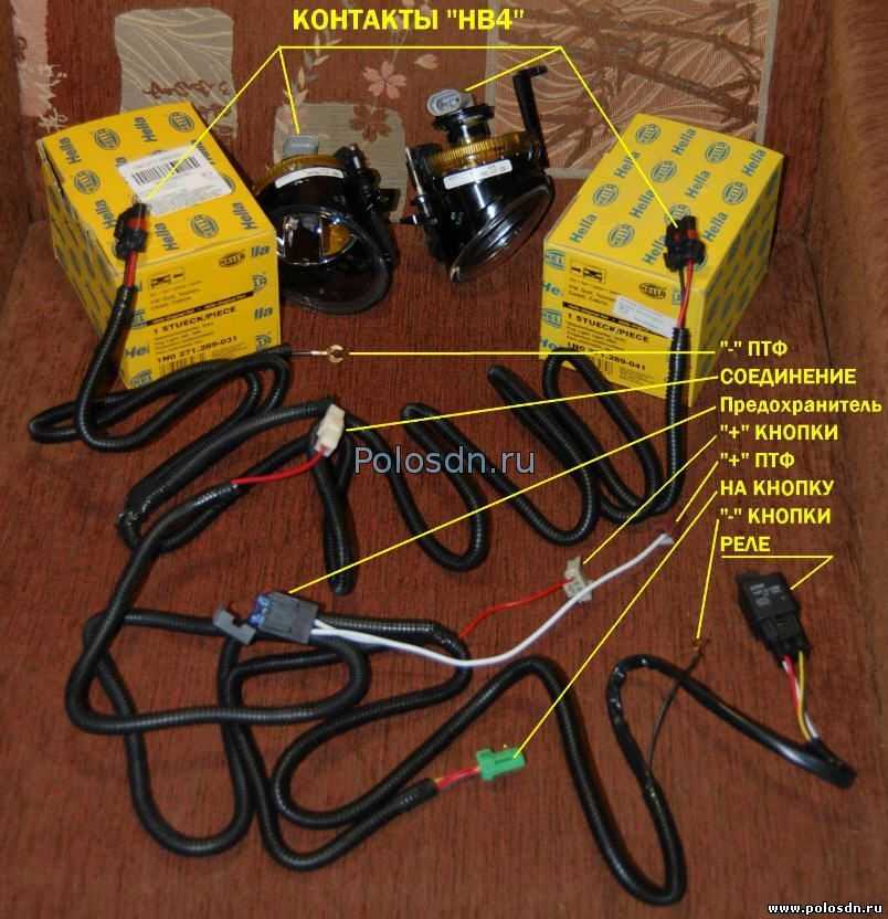 включающий в себя: разъемы к ПТФ (либо HB4, либо H11 в зависимости от цоколя лампочки), предохранитель, реле, клема к кнопке, клема к «+», клема к «-«.