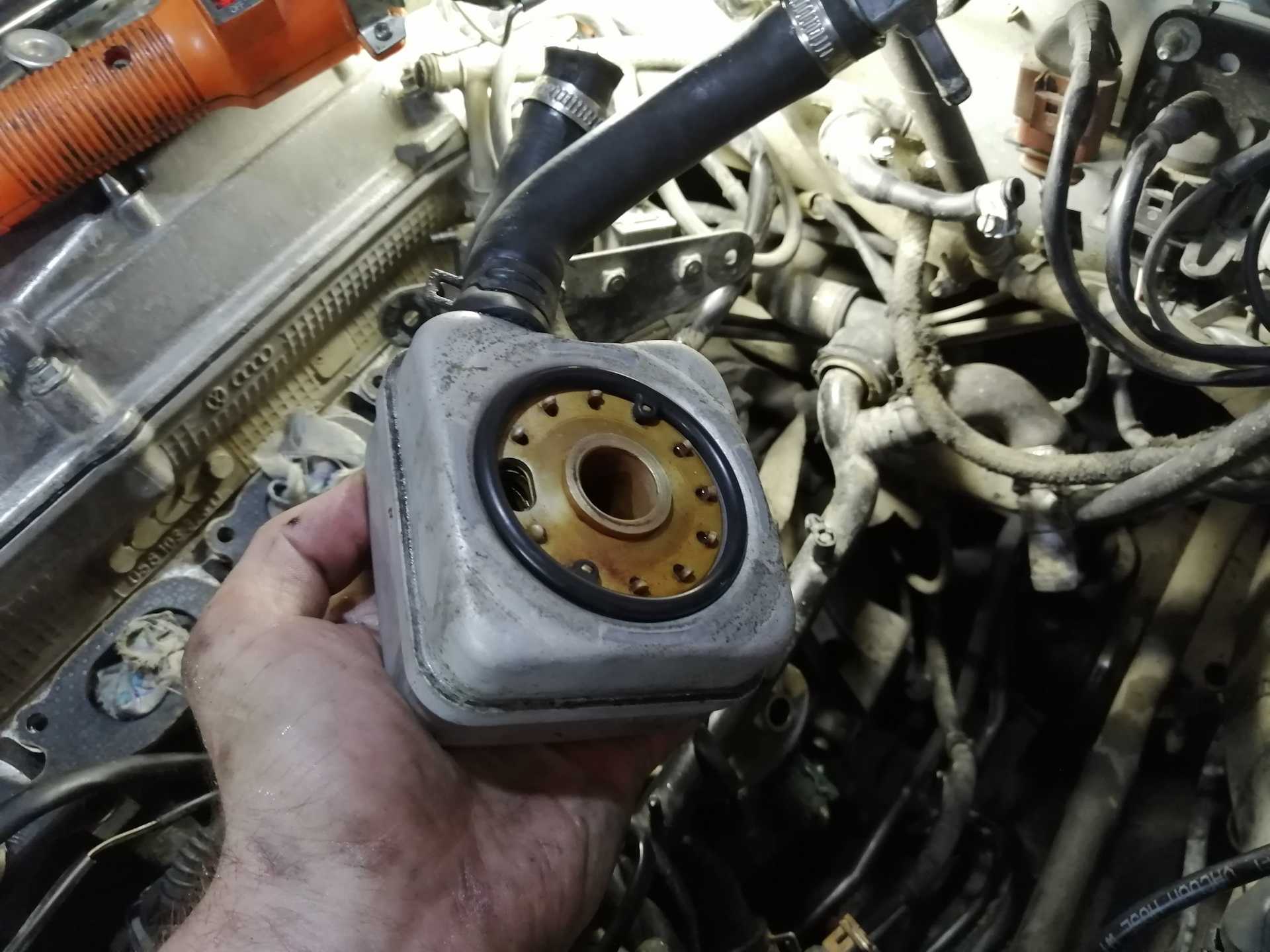 Чистой ветошью очищаем и обезжириваем посадочные места на ДВС. От масляного стакана снимаем резиновые прокладки (2 шт). Устанавливаем новые прокладки, закручиваем маслостакан. Те же операции производятся с прокладкой теплообменника. Последний устанавливается на место, подключаются все отсоединенные трубки и шланги.