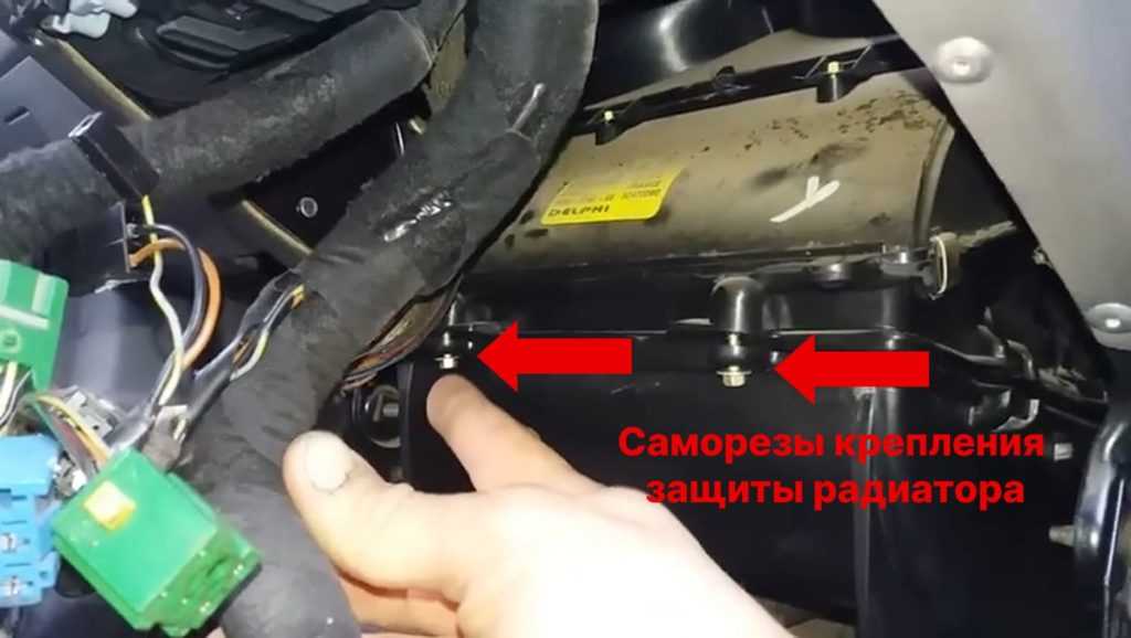 Под центральной консолью открывается защита радиатора печки, которую тоже нужно демонтировать. Для этого выкручиваются 2 самореза с шестигранными головками, которые установлены на наружной стенке.