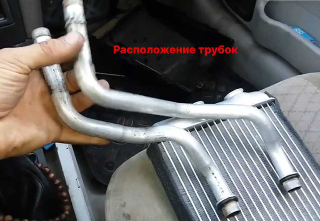 После освобождения трубок нужно вернуться в салон и просто потянуть радиатор отопления на себя. С небольшим усилием он снимется с посадочного места. Но сильно тянуть не нужно, поскольку он присоединен к трубкам пластмассовыми заделками, которые нужно разжать, после чего радиатор выходит без всяких проблем.