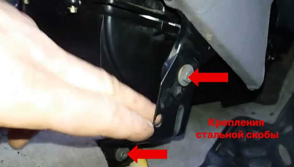 Далее нужно аккуратно раскрыть по 3 пластмассовые защелки, расположенные на боковых стенках защиты со стороны пассажира и водителя. Снимается стальная скоба крепежа радиатора, которая крепится со стороны пассажира на 2 болтах. После этого нижняя часть защиты выводится из крепления и открывается непосредственно теплообменник печки.