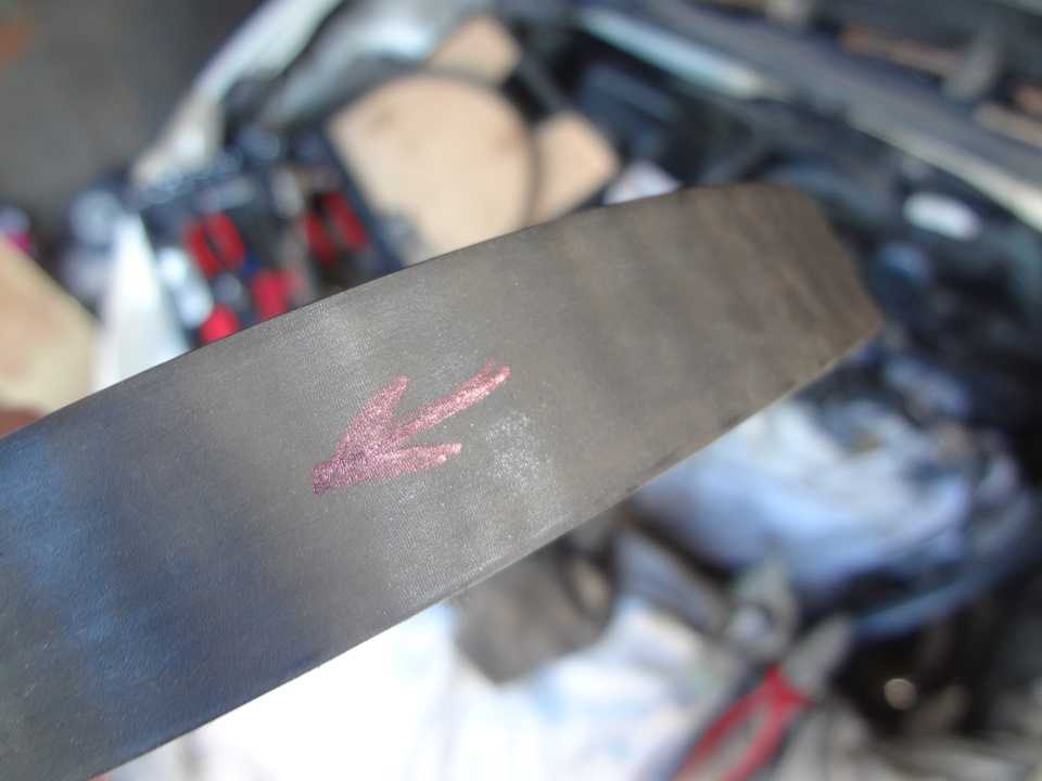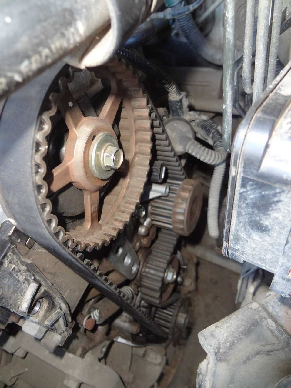 По книжке должна быть напротив первой одинокой черточки, у меня дальше, рядом с тремя. Тут то я и подумал, что ремень не по меткам стоит )) но возник другой вопрос — как он проскочил, да еще и в обратную сторону? (коленвал то против часовой крутится), это оставалось для меня загадкой до самой сборки ))