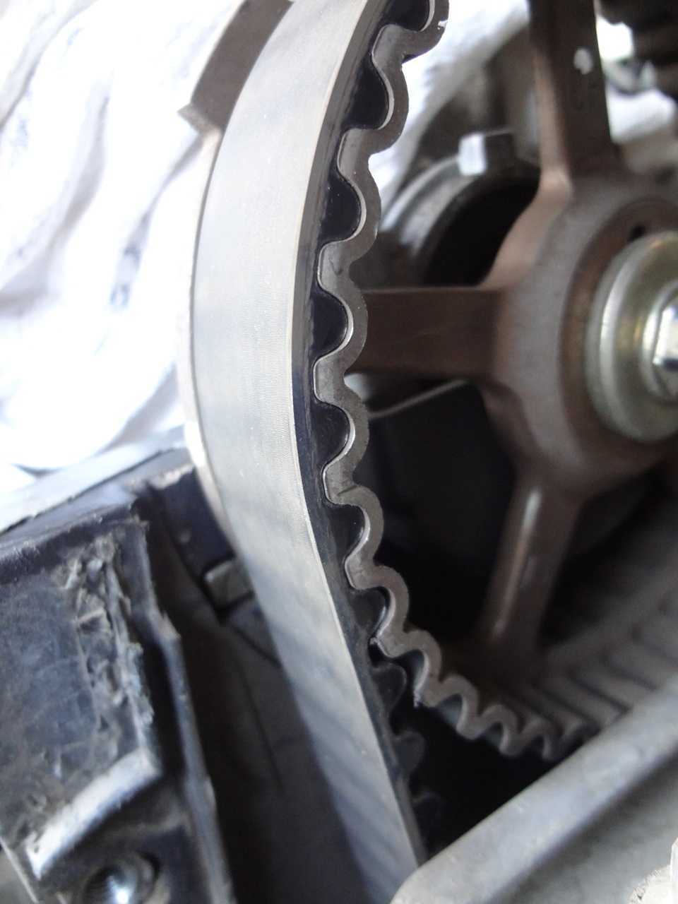 Ремень ставится следующим образом — сначала ставится на шкив коленвала, затем от колена максимально натягивается и тянется к шкиву распредвала, оттуда на помпу, а от помпы на ролик. Метки проверяются еще 20 раз, затем натягивается и одевается пружина ролика, а затем и болт. Ставится шкив распредвала, одевается шпока, шкив руками крутится пока вся система не провернется раза 2, затем проверяются метки, чтобы не ушли, если все ОК то снимаем шкив, ставим нижний кожух, подключаем датчик колена, и выставляем распредвал по метке и смотрим метку колена. У меня вышло вот так — почти, но если крутануть чуть шкив то метки сращиваются то уходят (а шкив буквально на миллиметры крутишь)
