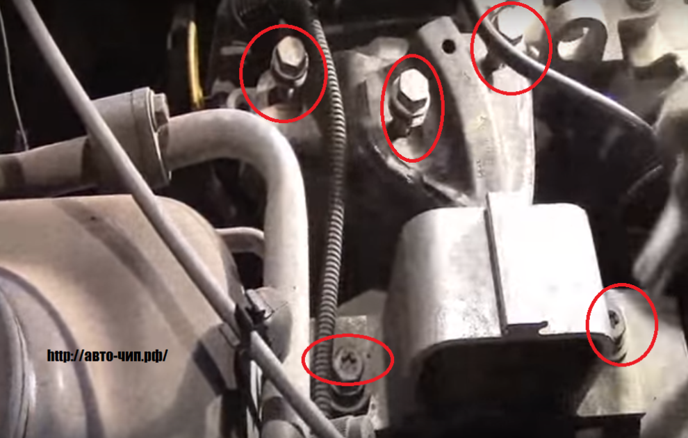 - Открутить три болта крепления опоры двигателя к картеру. Затем откручиваются две точки крепления опоры к лонжерону. Все болты имеют размер 16 мм.
