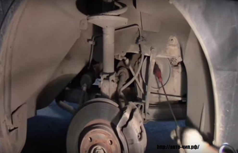Вывешиваем переднее правое колесо и снимаем его, снимаем защиту двигателя и правый пластиковый брызговик, он держится на двух пистонах и пластиковой гайки.