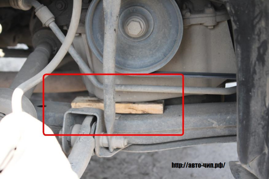 2 Нам необходимо подпереть двигатель для того чтобы снять правую подушку. Это можно сделать при помощи домкрата, либо вставить между подрамником у мотором кусок дощечки.