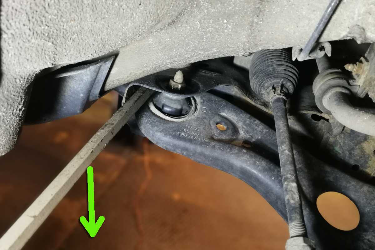 Вставив монтажную лопатку между рычагом подвески и подрамником аналогично проверяем задний сайлент-блок рычага передней подвески.