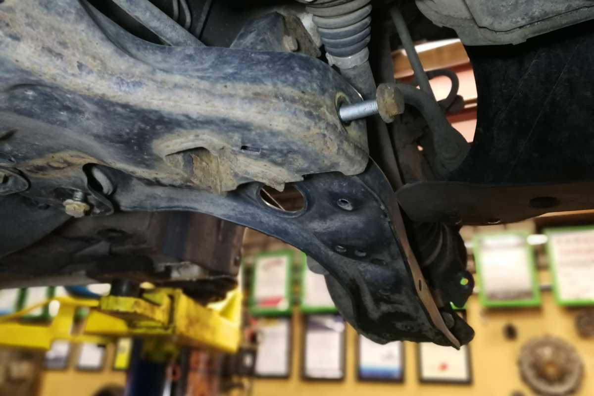 Вставляем болты. Но затягивать их можно только тогда, когда подвеска нагружена. То есть когда рычаг примет то положение относительно кузова, которое будет иметь, когда машина стоит на земле. Это положение можно сымитировать, подставив под рычаг в районе шаровой опоры стойку и опустив кузов так, чтобы лапа подъёмника освободилась.