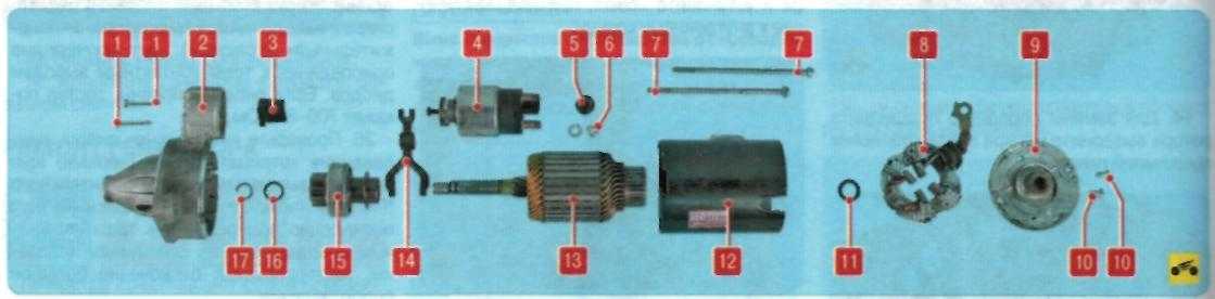 Детали стартера: 1 — винт крепления тягового реле; 2 — передняя крышка; 3 — опора рычага привода муфты свободного хода; 4 — тяговое реле; 5 — гайка контактного болта; б — гайка с шайбой крепления силовой шины; 7 — стяжной болт; 8 — щеточный узел; 9 — задняя крышка; 10 — винт крепления щеточного узла; 11 — дистанционное кольцо; 12 — корпус статора; 13 — ротор; 14 — рычаг привода муфты свободного хода; 15 — муфта свободного хода; 16 — ограничительное кольцо муфты свободного хода; 17 — стопорное кольцо
