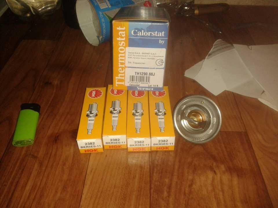 вечно я чем то недоволен, то едет не айс, то жрет много, то холодно зимой, с первыми двумя я разобрался, принялся за отопление салонакак-то курил инфу по рабочим температурам двигла в разных режимах и волей случая наткнулся на статью о замене термостата, термос этот от 12клапанного двигла и начало открытия у него 88С а не 82С как у 16кл собрата, виновники поездки в гараж все на фото(свечи просто в качестве то, сразу не поменял вместе с маслом, забыл…)