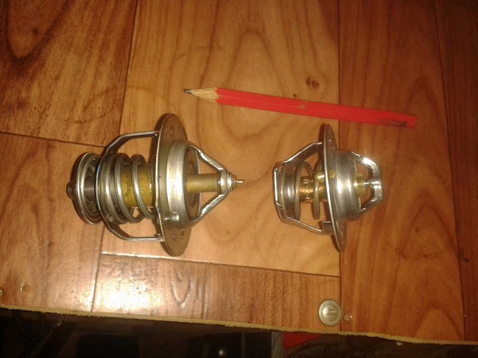 открутив снимаем крышку, выбежит немного жижы, не страшно, и вот видно термос, сидит плотно как партизан в кустах, мне удалось его выбить только ударом киянкивот я достал родной термос, положил рядом с новым и нихрена не понял почему он в 2 раза длинее и зачем на нем вторая пружина с блюдцем, пару минут всматривался в корпус термостата и его устройство, положил здоровенный хер на все мысли и поставил новый, если не понравится переделаю, благо это быстро