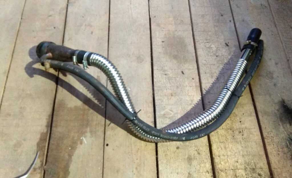 Далее отрезал от патрубка две трубки, которые нужны будут для соединения горловины с гофротрубой и гофротрубы с бензобаком. Соединил горловину с гофротрубой и обжал хомутами.