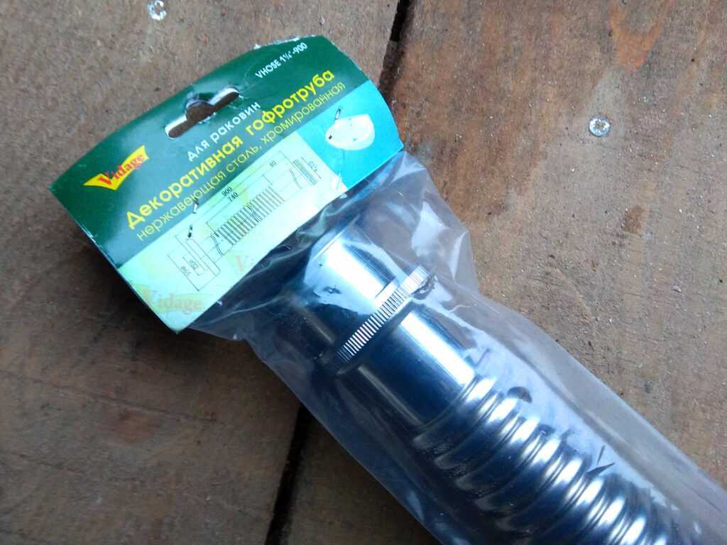 В строительном магазине Леруа Мерлен была куплена гофротруба для раковин из нержавеющей стали (длина 900 мм). Диаметр трубок гофротрубы с обоих сторон равен 32 мм.